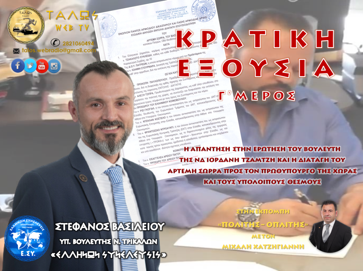 ΔΙΚΑΙΩΜΑΤΩΝ ΑΠΑΝΤΑ ΣΕ ΕΡΩΤΗΣΗ ΠΟΥ ΚΑΤΕΘΕΣΕ ΣΤΗΝ ΒΟΥΛΗ ΤΩΝ ΕΛΛΗΝΩΝ Ο ΒΟΥΛΕΥΤΗΣ ΤΗΣ ΝΔ ΙΟΡΔΑΝΗΣ ΤΖΑΜΤΖΗΣ ΟΣΟΝ ΑΦΟΡΑ ΤΗΝ ΔΡΑΣΤΗΡΙΟΤΗΤΑ ΤΗΣ ΕΤΑΙΡΕΙΑΣ ΕΝD ΚΑΙ ΤΟΥ ΑΡΤΕΜΗ ΣΩΡΡΑ ΚΑΙ ΛΕΕΙ ΟΤΙ ΔΕΝ ΥΠΑΡΧΕΙ ΚΑΤΙ ΜΕΜΠΤΟ ΟΣΟΝ ΑΦΟΡΑ ΤΗΝ ΔΥΝΑΤΟΤΗΤΑ ΠΟΥ ΕΧΟΥΝ ΟΙ ΔΗΜΟΙ ΝΑ ΔΟΜΗΘΕΙ ΑΤΟΚΗ ΧΡΗΜΑΤΟΔΟΤΗΣΗ ΥΠΕΡ ΤΟΥ ΔΗΜΟΥ ΤΟΥΣ. ΤΟ 2016 Ο ΑΡΤΕΜΗΣ ΣΩΡΡΑΣ ΔΙΝΕΙ ΕΞΩΔΙΚΗ ΔΗΛΩΣΗ - ΕΝΤΟΛΗ - ΔΙΑΤΑΓΗ - ΕΞΟΥΣΙΟΔΟΤΗΣΗ ΣΤΟΝ ΠΡΟΘΥΠΟΥΡΓΟ ΤΟΤΕ ΑΛΕΞΗ ΤΣΙΠΡΑ ΣΤΟΝ ΥΠ. ΟΙΚΟΝΟΜΙΚΩΝ ΤΣΑΚΑΛΩΤΟ ΣΤΟΝ ΠΡΟΙΣΤΑΜΕΝΟ ΤΗΣ ΔΟΥ ΠΑΤΡΕΩΝ ΣΤΟΝ ΠΡΟΕΔΡΟ ΤΗΣ ΔΗΜΟΚΡΑΤΙΑΣ ΠΡΟΚΟΠΗ ΠΑΥΛΟΠΟΥΛΟ ΣΤΟΝ ΠΡΟΕΔΡΟ ΤΟΥ ΕΛΛΗΝΙΚΟΥ ΚΟΙΝΟΒΟΥΛΙΟΥ ΣΤΟΝ ΕΚΠΡΩΣΟΠΟ ΤΟΥ ΔΝΤ ΣΤΗΝ ΕΛΛΑΔΑ ΡΙΣΙ ΓΚΟΓΙΑΛ ΣΤΟΝ ΕΚΠΡΩΣΟΠΟ ΤΗΣ ΕΥΡΩΠΑΙΚΗΣ ΕΠΙΤΡΟΠΗΣ ΣΤΗΝ ΕΛΛΑΔΑ ΝΤΕΚΛΑΝ ΚΩΣΤΕΛΟ ΣΤΟΝ ΕΚΠΡΩΣΟΠΟ ΤΗΣ ΕΥΡΩΠΑΙΚΗΣ ΚΕΝΤΡΙΚΗΣ ΤΡΑΠΕΖΑΣ ΦΡΑΝΤΖΕΣΚΟ ΝΤΡΟΑΥΝΤΙ ΚΑΙ ΤΗΝ ΚΟΙΝΟΠΟΙΕΙ ΣΤΟΝ ΕΙΣΑΓΓΕΛΕΑ ΚΑΙ ΣΤΟΝ ΠΡΟΕΔΡΟ ΤΟΥ ΑΡΕΙΟΥ ΠΑΓΟΥ. ΟΛΑ ΑΥΤΑ ΜΑΣ ΑΝΑΛΥΕΙ Ο ΚΥΡΙΟΣ ΣΤΕΦΑΝΟΣ ΒΑΣΙΛΕΙΟΥ, ΥΠ. ΒΟΥΛΕΥΤΗΣ Ν. ΤΡΙΚΑΛΩΝ ΜΕ ΤΗΝ ΕΛΛΗΝΩΝ ΣΥΝΕΛΕΥΣΙΣ, ΚΑΛΕΣΜΕΝΟΣ ΣΤΗΝ ΕΚΠΟΜΠΗ ΤΟΥ ΡΑΔΙΟ ΤΑΛΩΣ "ΠΟΛΙΤΗΣ - ΟΠΛΙΤΗΣ" ΜΕ ΤΟΝ ΜΙΧΑΛΗ ΧΑΤΖΗΓΙΑΝΝΗ.